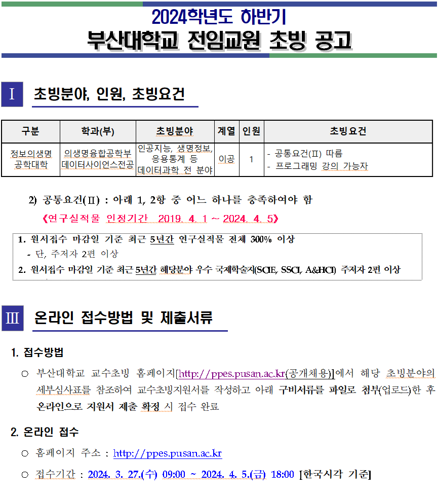 [채용]부산대학교 의생명융합공학부 데이터사이언스 전공 교수 초빙공고