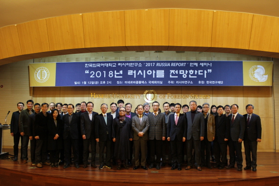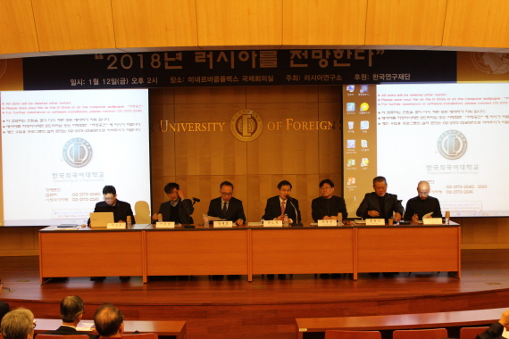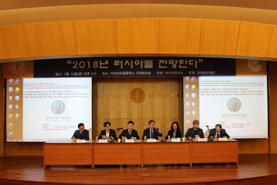 2018년  1월  12(우리연구소는 한국외대 서울캠퍼스 미네르바콤플렉스 국제회의실에서 연례보고서  RUSSIA REPORT 발행의 일환으로  “2018 러시아를 전망한다 ” 제하의 국내학술대회를 개최했다 우리연구소의  2018년 첫 학술행사로서 본 회의에는 러시아 전문가와 학문후속세대 등 총  50여 명이 참석하여 성황을 이뤘다 .
