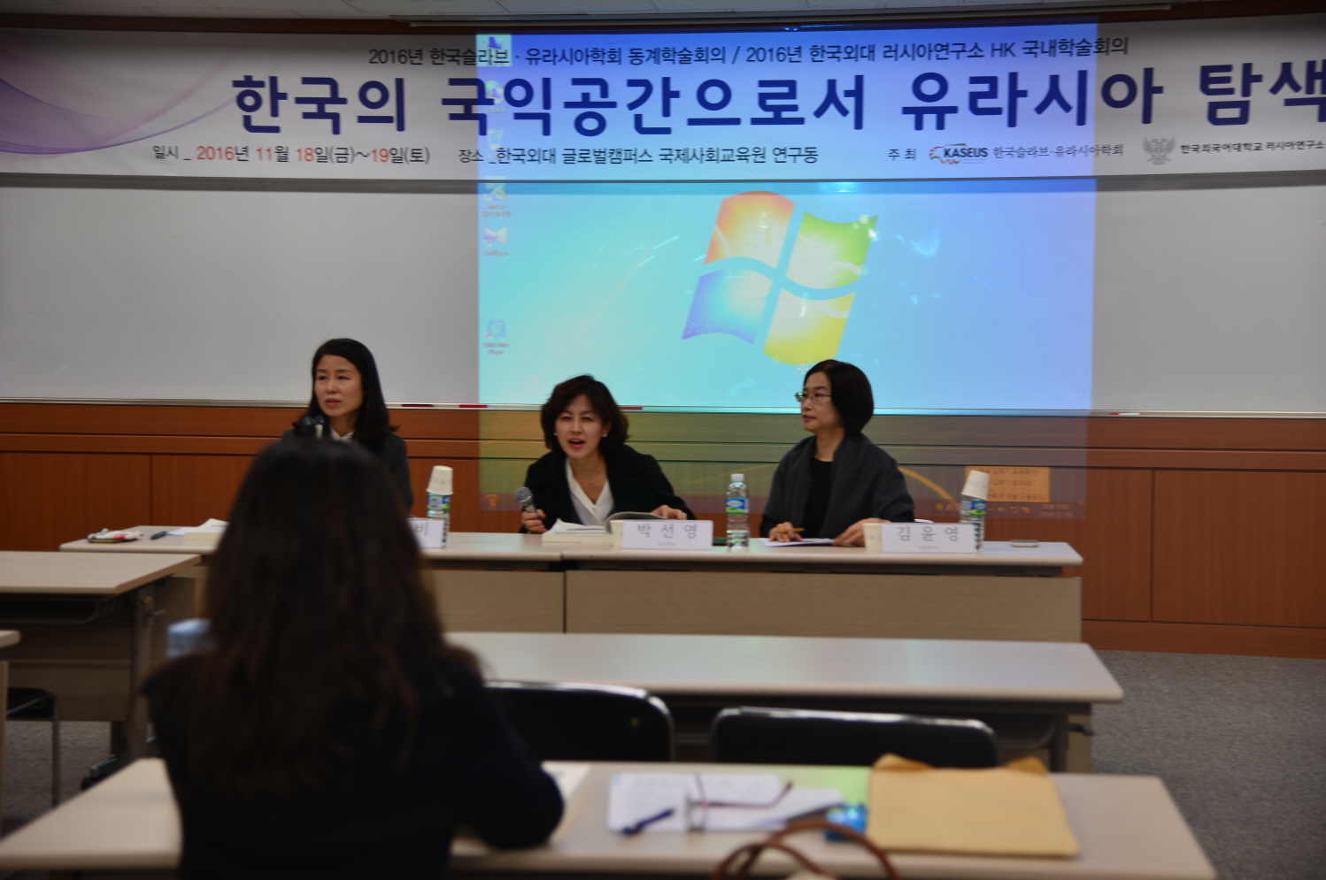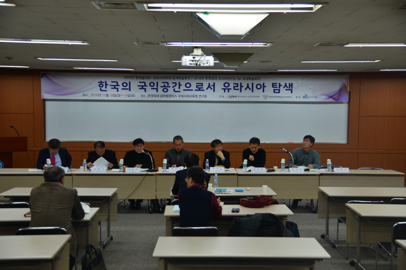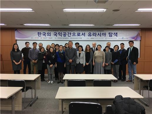 2016년  11월  18()~19(이틀에 걸쳐 러시아연구소는 글로벌캠퍼스 국제사회교육원 우덕홀에서 한국 슬라브 ·유라시아학회와 공동으로  한국의 국익 공간으로서 유라시아 탐색 이라는 주제로  HK(Humanities Korea) 국내학술회의를 개최했다 본교 러시아학과 교수인 홍완석 슬라브 ·유라시아 학회장의 축사로 시작된 학술회의에는  12개 세션을 통해 국내외 러시아 전문가 및 학문후속세대 등 총  36명이 발표에 참여했고 , 36편의 논문이 발표됐다 러시아연구소 소속 전임인력들은 인문한국사업  3단계 세부주제인  러시아 인문공간의 제한성과 잠재력 을 구체화시키는 개별 주제들을 발표했다 김선래 교수는  동북아 경제협력 거버넌스  GTI의 신현실주의적 분석 ,” 배은경 교수는  “1920년대 소련 원동고려문단의 초기 형성과정 ,” 최우익 교수는  러시아 북귺권 주민의 사회 ·경제적 변화와 특성 ,” 김혜진 교수는  마리 디아스포라의 이중신앙 ,” 장세호 교수는  러시아 제 7기 국가두마 선거와 선거제도 개편의 제도효과 ,” 라승도 교수는  포스트소비에트 러시아 영화에 나타난 북극 신화 를 발표했다 .