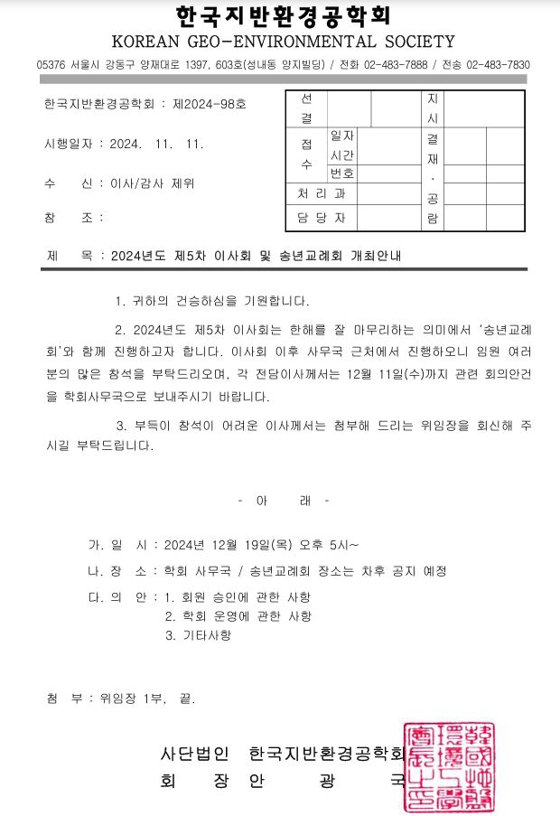 2024년도 제5차 이사회 및 송년교례회 개최안내