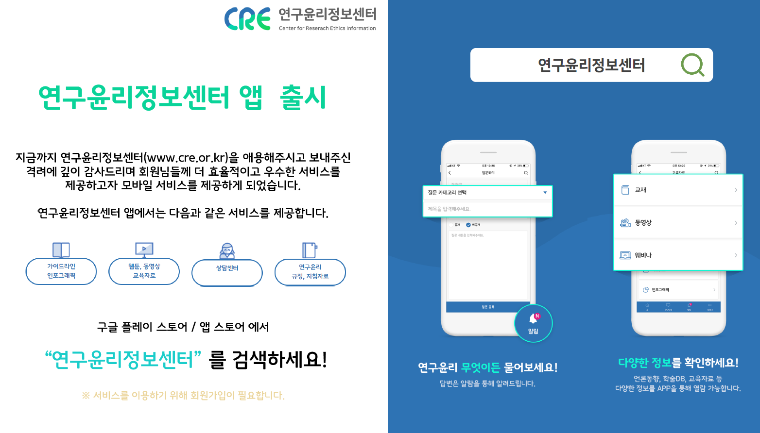 회원님들께 연구윤리정보센터(www.cre.or.kr) 앱 출시를 알려드립니다.