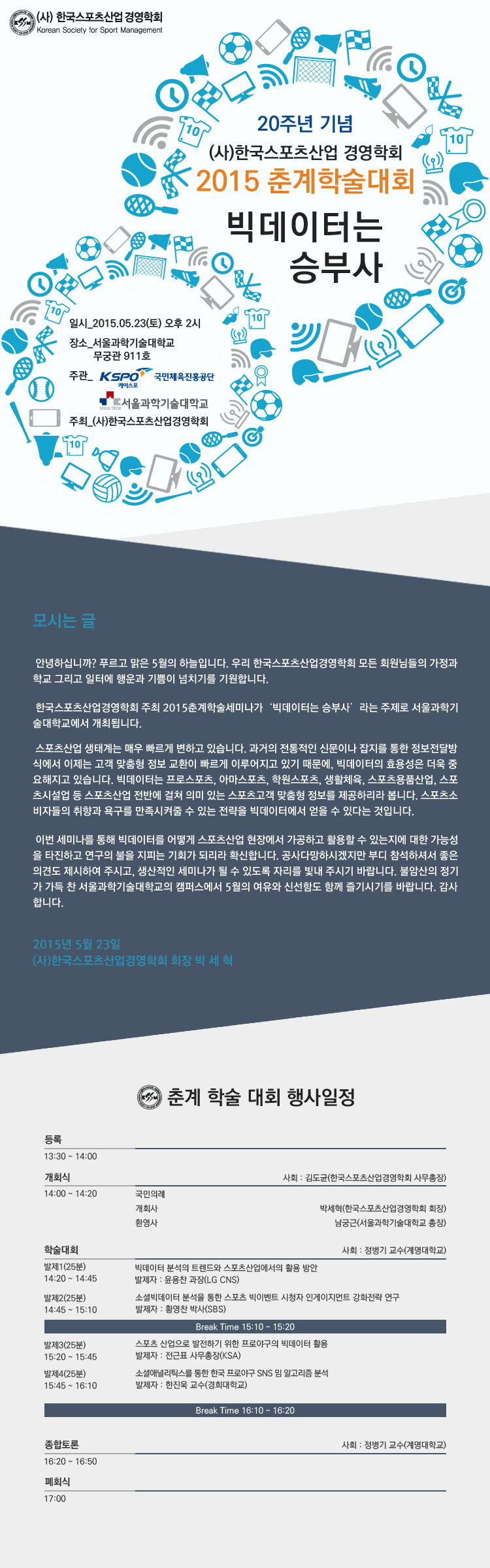 감사합니다. 5월 23일 좋은 내용으로 스포츠와 빅데이터에 대해서 관심 많으신 분들을 찾아뵙겠습니다.