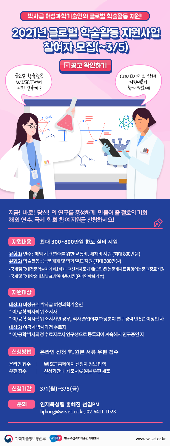 [홍보] [WISET] 여성연구자를 위한 글로벌 학술활동 지원사업(최대 800만원) 수혜자 모집 홍보