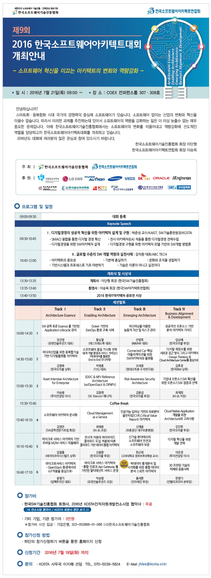 오는 7월21일, 한국소프트웨어기술진흥협회(KOSTA)에서는 아키텍쳐 등 SW 선도기술을 주제로 한국 SW기술의 미래비전을 제시하는 ' 2016 제 9회 한국소프트웨어 아키텍트 대회 ' 를 개최하게 되었습니다. 코엑스컨퍼런스룸에서 귀빈들을 초청하는 개막식 행사와 함께 키노트 스피치, 트랙별 세션 발표의 컨퍼런스 행사가 진행되어 안내드리오니 관심있는 분들의 참여 바랍니다. 감사합니다.