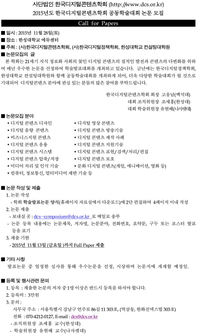 제16회 한국디지털콘텐츠학회 공동학술대회 논문모집 ■ 일시 : 2015년 11월 28일(토) ■ 장소 : 한성대학교 에듀센터 ■ 주최 : (사)한국디지털콘텐츠학회, (사)한국디지털정책학회, 한성대학교 컨설팅대학원 ■ 논문모집의 글 본 학회는 21세기 지식 정보화 사회의 꽃인 디지털 콘텐츠의 질적인 발전과 콘텐츠의 다변화를 위하여 매년 우수한 논문을 선정하여 학술발표대회를 개최하고 있습니다. 금년에는 한국디지털정책학회, 한성대학교 컨설팅대학원와 함께 공동학술대회를 개최하게 되어, 더욱 다양한 학술대회가 될 것으로 기대되어 디지털콘텐츠 분야에 관심 있는 분들의 많은 참여를 부탁드립니다. 한국디지털콘텐츠학회 회장 고응남(백석대) 대회 조직위원장 조세홍(한성대) 대회 학술위원장 유현배(나사렛대) 주 요 일 정 논문 원고마감 --------------------------------------2015년 11월 13일(금) 학술대회 일정 --------------------------------------2015년 11월 28일(토) 논문 발표분야 디지털융합정책, 스마트정책, 빅데이터 분야 : 스마트정부, 스마트경영, 스마트기술,디지털융합정책, 스마트 관련 정책, 디지털기술과 빅데이터, 정보화와 기업경쟁력, 빅데이터 및 융합신산업 우수사례, 빅데이터와 IoT산업 육성정책, 차세대 지식서비스 신산업 전략, 지식서비스 및 컨설팅산업의 선진화 전략, 1인 지식기업과 기업의 국제경쟁력 방안 등 스마트융합, 지식서비스&컨설팅 분야 : 컨설팅 방법론, 컨설팅 Toolkit 개발, 컨설팅 사례연구, 자영업 컨설팅, 소상공인 컨설팅, 쿠폰제 컨설팅, 이노비즈기업 컨설팅, 벤처기업 컨설팅, 수출기업 컨설팅, FTA 컨설팅, 경영컨설팅, 기술컨설팅, 구조조정 컨설팅CSR 컨설팅, 디자인 컨설팅, 컨버전스 컨설팅, 협업 컨설팅, 그린 컨설팅, 지식융합 및 지식서비스 논문 작성 및 제출 유의사항 첨부한 'TemplateFile' 다운로드 받아 논문 작성 후 메일(dcs-symposium@dcs.or.kr)로 접수. 구두발표 : 구두 발표자는 정해진 발표자료(PPT)파일 준비 ★ 석사과정 대학원, 일반 대학생(학부생) 각각 학술대회 세션, 시상 별도로 구성 ★ 논문양식은 홈페이지 '자료실-주요양식' 에서도 다운받으실 수 있습니다. - 양식다운받기 >> http://dcs.or.kr/bbs/board.php?bo_table=download&wr_id=14