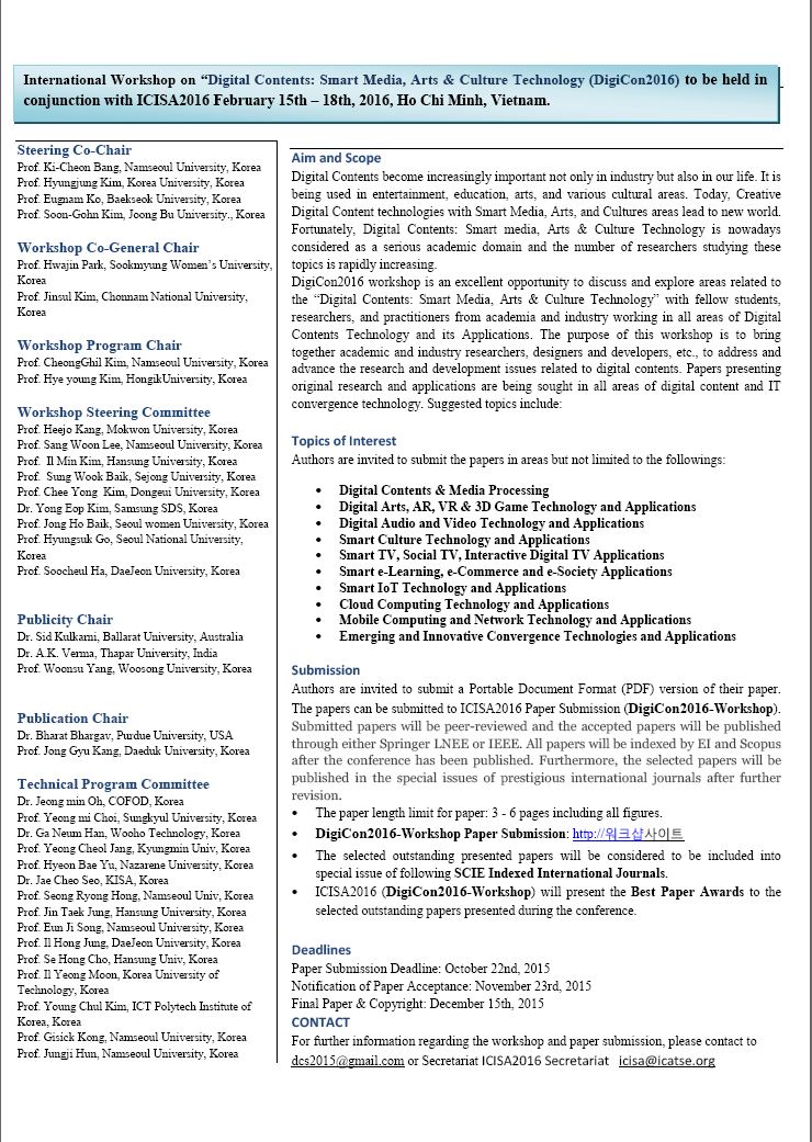 디지털콘텐츠학회에서 국제워크샵을 개최합니다. 학회 회원님들의 많은 참여를 부탁드리며, Scopus와 SCI급 저널에 우수 논문은 게제를 할 예정입니다. 2016년도 행사는 2월 베트남 호치민에서 개최됩니다. 다시한번 많은 참여를 부탁드립니다.