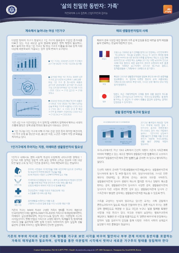 지속적으로 늘어나는 여성1인가구를 분석했다. 정책지원대상의 세분화를 제안하고, 4인가족이 기준이 되었던 사회복지 정책에서 벗어난 새로운 정책관점과 1인 가구에 주어지는 지원, 이에 따른 생활 동반자의 필요성을 해외 생활동반자법의 사례를 통해 연구했다. 아울러, 비교법적 연구를 통해, 생활동반자법의 촉구와 필요성을 제언한다.