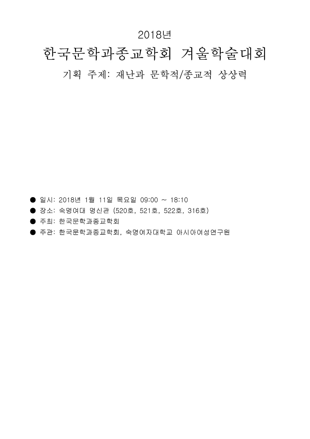 아시아여성연구원 공동주관 2018년 한국문학과종교학회 겨울학술대회(기획주제: 재난과 문학적/종교적 상상력)