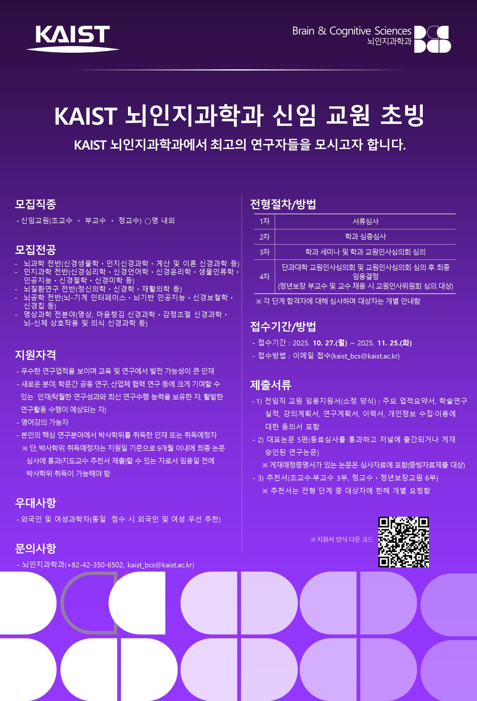 채용에 대한 자세한 내용과 지원 방법은 KAIST 뇌인지과학과 홈페이지의 공식 공고를 참고하시기 바랍니다.