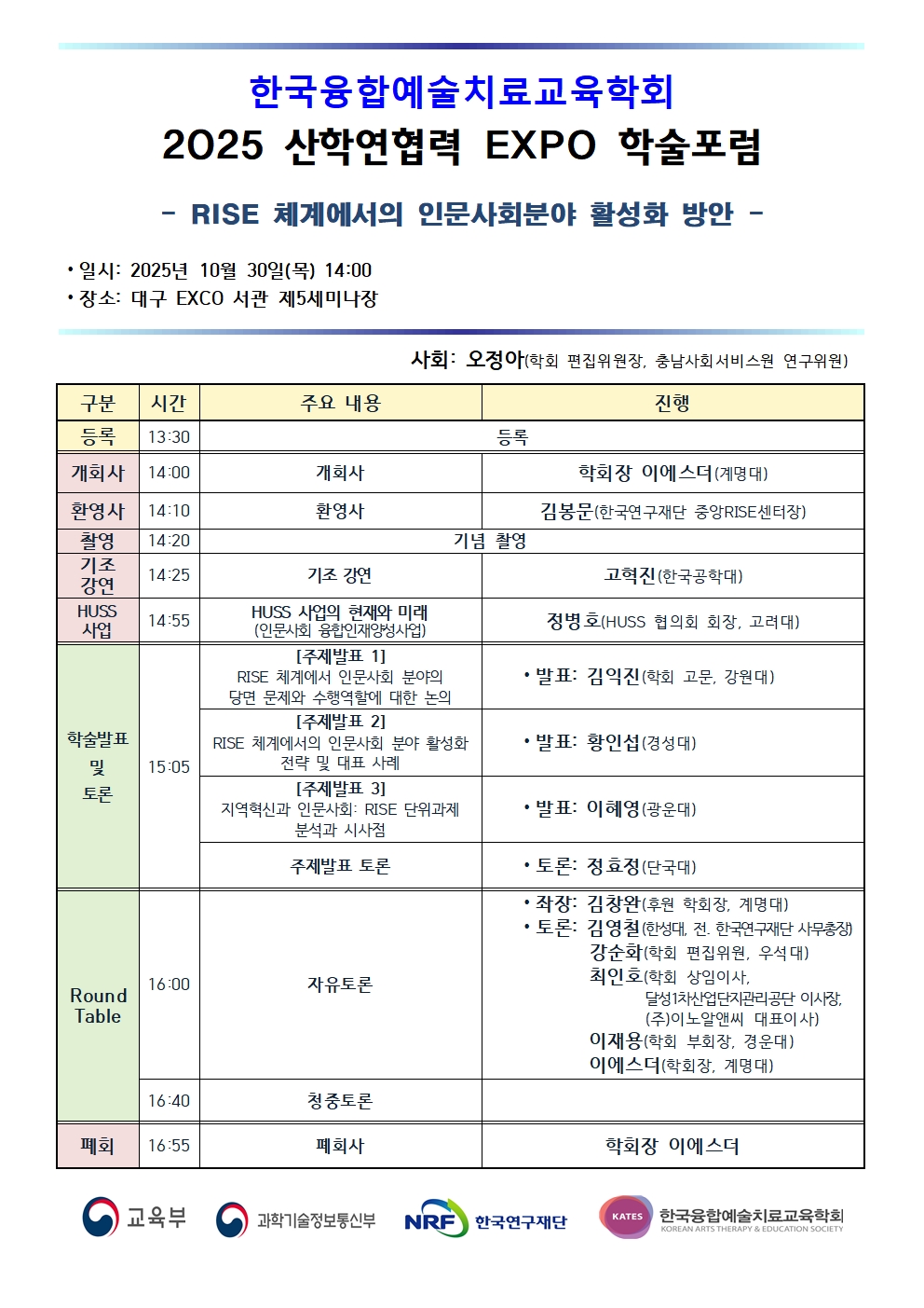 올해는 교육부, 과기정통부, 한국연구재단이 공동주최하는 <2025 산학연협력 EXPO>에 우리학회가 영광스럽게도 초대(후원)를 받아서 개최하는 [2025 한국융합예술치료교육학회 학술포럼]이 어느덧 하루 앞으로 다가왔습니다.