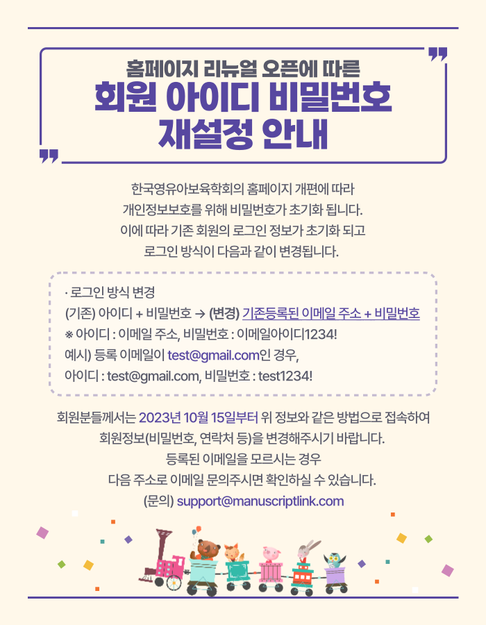 한국영유아보유학회의  홈페이지·은라인논문투고시스템  계정이 통합되었습니다.