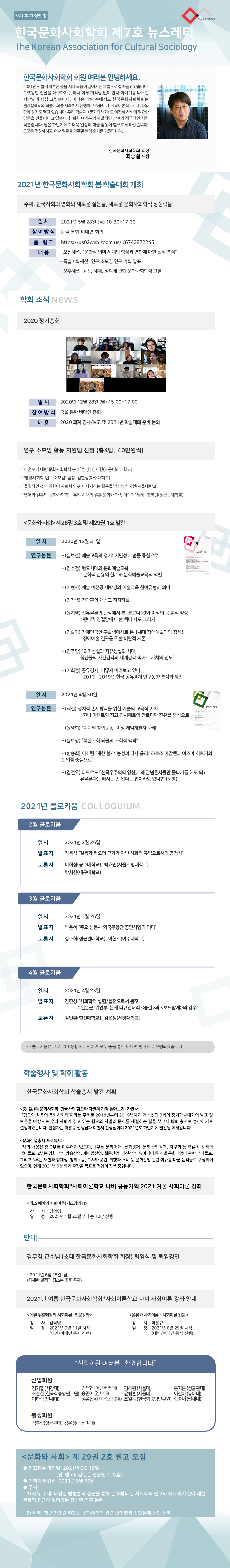 한국문화사회학회 뉴스레터 제7호(2021년 6월)가 나왔습니다.