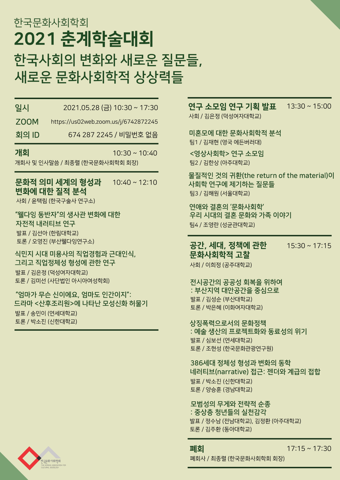 2021 춘계 학술대회 안내 (한국사회의 변화와 새로운 질문들, 새로운 문화사회학적 상상력들)