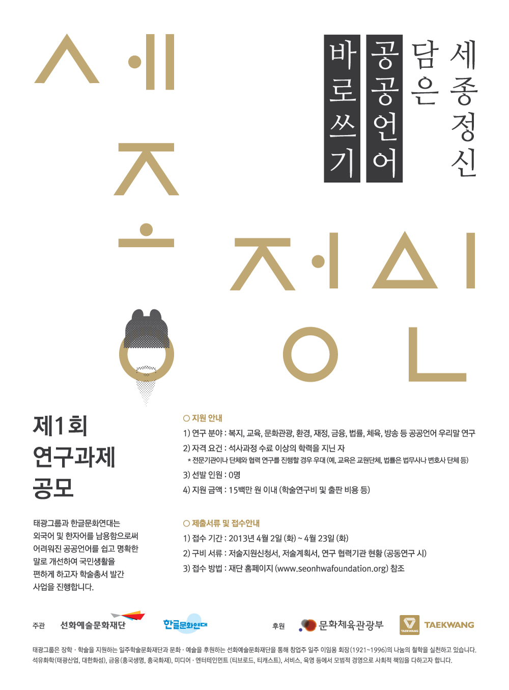 한글문화연대와 태광그룹은 외국어와 한자어를 남용하여 어려워진 공공언어를 국민 누구나 알기 쉽고 명확한 말로 다듬어 국민생활을 편하게 하고자 '세종정신 담은 공공언어 학술총서 발간' 사업을 합니다.