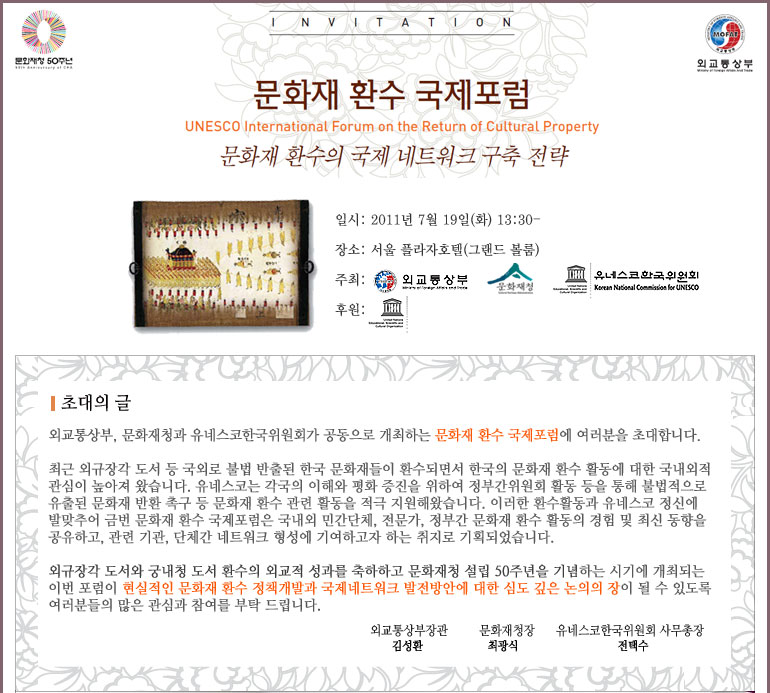 문화재환수 국제포럼 초청장입니다.