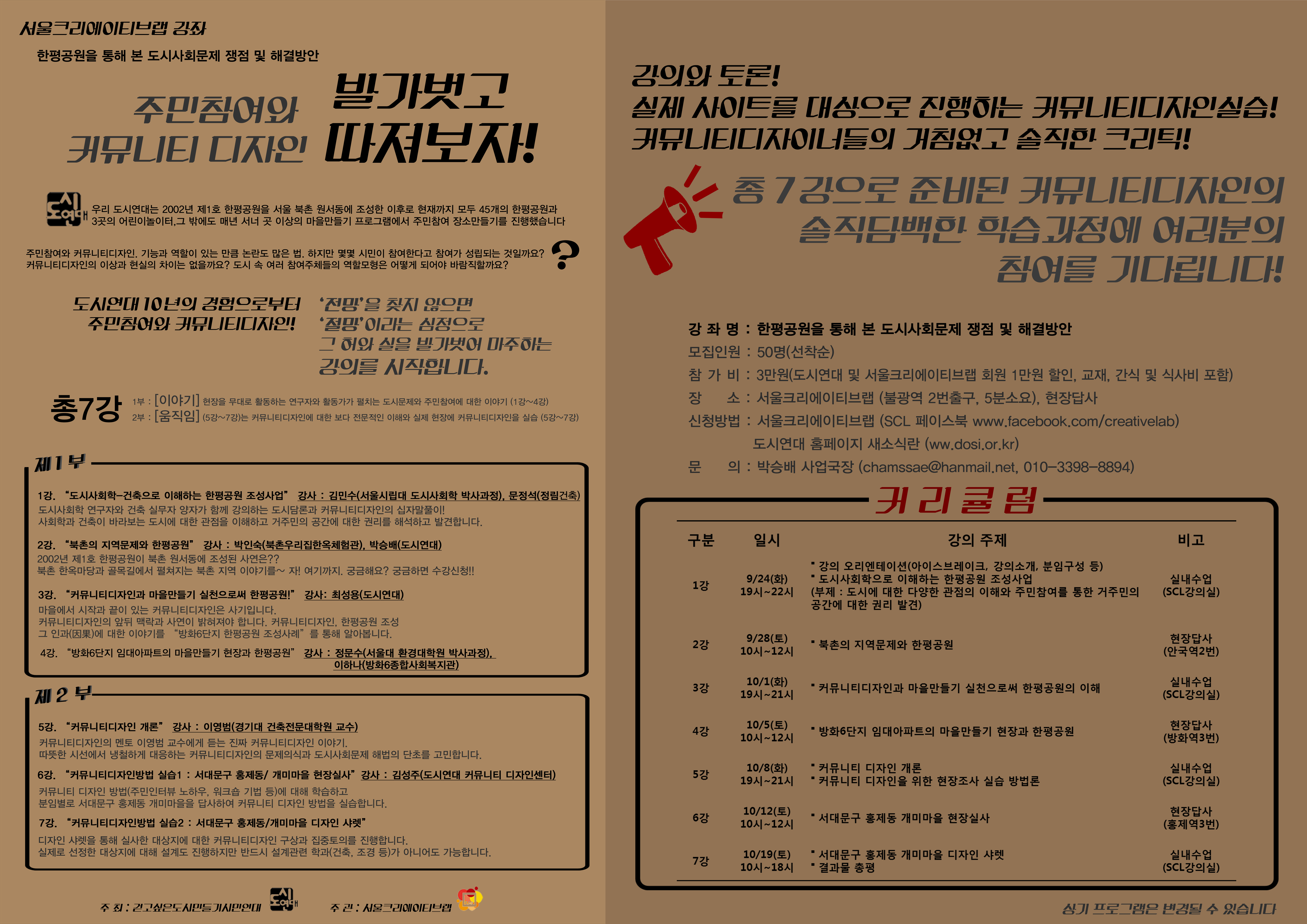 (사)걷고싶은 도시만들기 시민연대와 서울크리에이티브랩이 함께 <한평공원을 통해 본 도시사회문제 쟁점 및 해결방안>이라는 주제로 강의를 기획하였습니다. 관심있는 분들의 많은 참여바랍니다.