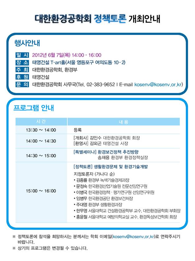 대한환경공학회에서 정책토론회를 개최합니다. 자세한 일정 및 내용은 첨부된 파일을 참조바랍니다.