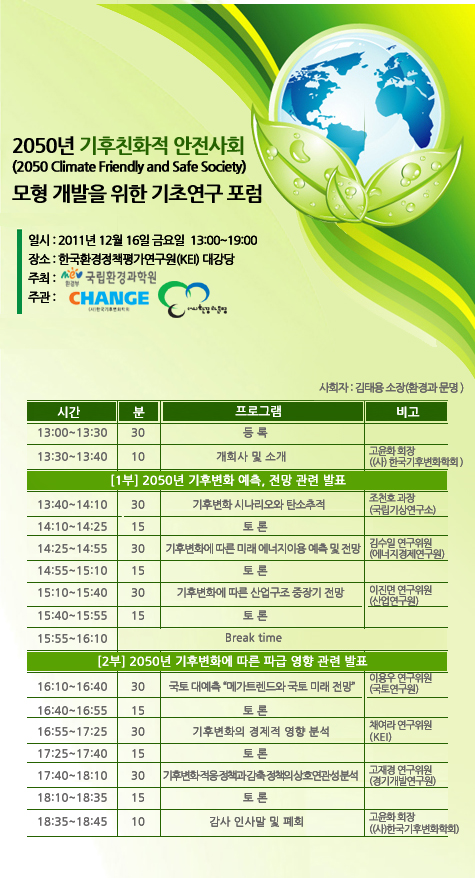 [포럼 개최안내] 2050년 기후친화적 안전사회 모형 개발을 위한 기초연구 포럼 (사)한국기후변화학회와 (사)환경과문명이 공동으로 ‘2050년 기후친화적 안전사회(2050 Climate Friendly and Safe Society ; 2050 CFSS) 모형 개발을 위한 기초연구’ 과제의 보다 성공적인 연구진행 및 성과를 위하여 ‘2050년 기후변화 예측, 전망’ 과 ‘2050년 기후변화에 따른 파급 영향’에 관한 주제로 ‘2050년 기후친화적 안전사회 모형 개발을 위한 기초연구’ 포럼을 개최합니다. ■ 일시 : 2011년 12월 16일(금) 13:00 ~ 19:00 ■ 장소 : 한국환경정책평가연구원(KEI) 대강당 바쁘시더라도 부디 참석하시어 고견을 나누어 주시고, 아무쪼록 이번 회의가 향후 우리나라의 기후변화 대응정책개발 연구에 밑거름이 될 수 있도록 적극적인 참여와 토론을 부탁드립니다. 첨부 : 홍보 시안(포럼 운영)