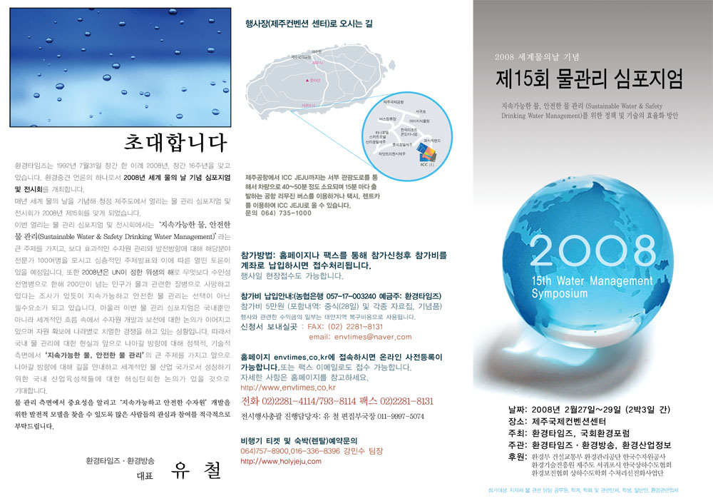 제15회 물 관리 심포지엄 2008년 세계 물의 날 기념, 제15회 물 관리 심포지엄 안내 ▶ 세부주제: 지속가능한 물, 안전한 물 관리(Sustainable Water & Safety Drinking Water Management)를 위한 정책 및 기술의 효율화 방안 ▶ 분 야: 상하수도, 지하수, 빗물, 하천, 심층수, 물 산업 전반 ▶ 참가대상: 지자체 물 관련 담당 공무원, 학계, 학회 및 관련단체, 학생, 일반인, 환경관련업체 ▶ 장 소: 제주도 서귀포시 제주국제컨벤션센터(www.iccjeju.co.kr) ▶ 주 관: 환경타임즈·환경방송, 환경산업정보 (www.envtimes.co.kr)/(www.gkbs.co.kr) ▶ 주 최: 환경타임즈, 국회환경포럼 ▶ 날 짜: 2008년 2월27일~29일 (2박3일 간) 세 부 일 정 1일차 2월27일 (수) PM1시 등록/PM2시 PM2시~6시30분주제발표·전시 2일차2월28일 (목) AM10시 ~ PM 6시개회, 주제발표 및 토론전시 관람 3일차 2월29일 (금) A코스 - 한국공항 (유리온실, 물 공장, 목장) B코스 - 제주하이테크산업진흥원 방문 (코스 선택) AM10시~12시 4일차 3월 1일(토) 생태탐방 (선택) - 한라산 등정 ● 참가비용: 5만원(1인당) <내역: 세미나책자, 기념품, 현장탐방, 28일 중식> ● 행사와 관련한 수익금의 일부는 태안지역 복구비용으로 사용됩니다. ● 숙박 및 항공(렌탈): 064-757-8900/016-336-8396 강민수 팀장 ● 전시부스 및 세미나 참석문의: 02-2281-4114/011-9997-5074 류 철 편집국장 ● 참가신청 - 온라인접수 www.gkbs.co.kr (프로그램 및 세부사항 참조)