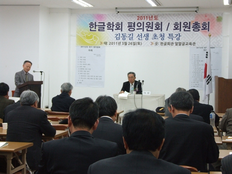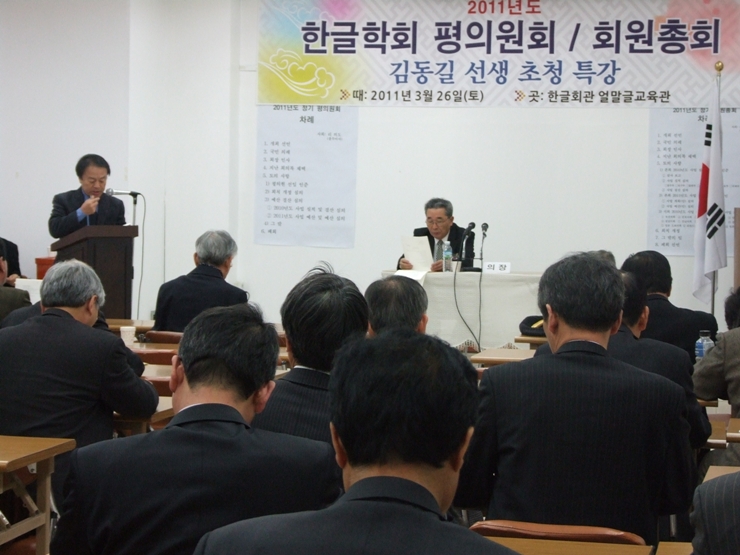 ▲ 2011년도 한글학회 정기 회원총회에서 지회 보고를 하고 있는 정동환 인천지회장(협성대 교수)의 모습(위 사진)과 경남지회 김정대 지회장을 대신하여 보고 하고 있는 김형철 회원의 모습(아래 사진).
