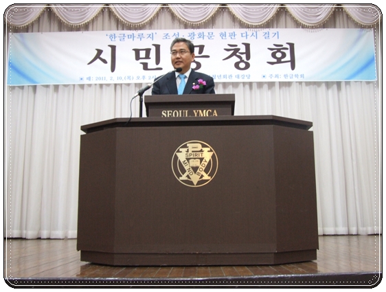 2011년 2월 11일 오후 2시부터 서울기독교청년회관(YMCA, 종로2가) 대강당에서 열린 '한글마루지 조성/광화문 현판 다시 걸기 시민 공청회'의 모습. 격려말씀을 하고 있는 박진 국회의원(위)과 김을동 국회의원(아래)의 모습.