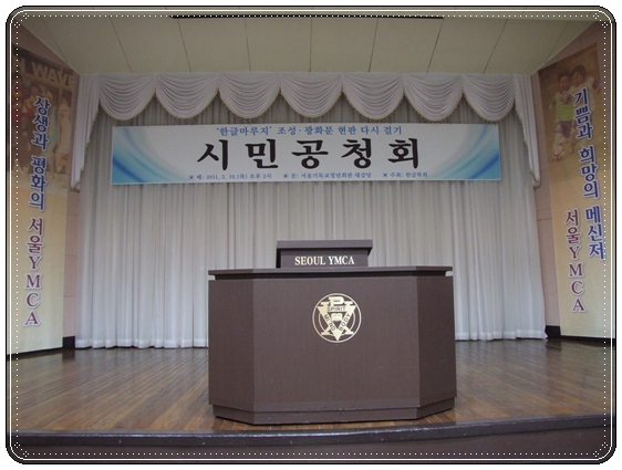 2011년 2월 11일 오후 2시부터 서울기독교청년회관(YMCA, 종로2가) 대강당에서 열린 '한글마루지 조성/광화문 현판 다시 걸기 시민 공청회'의 모습. 공청회 펼침막(위)과 모인 사람들의 모습(아래).