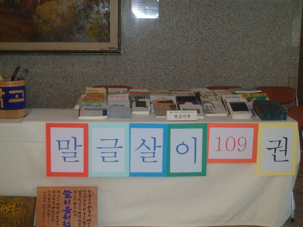 2005년 10월 6일 (목) 오후 2시부터 국회 국회의원회관 대회의실에서 있었던 한글인터넷주소추진총연합회 주최 제2회 한글 문화 정보화 포럼 행사의 한 모습입니다. 사진은, 한글 관련 책 '말글살이 109권' 전시 모습입니다. <찍은 이: 꿈돌이(2005.10.6.)>