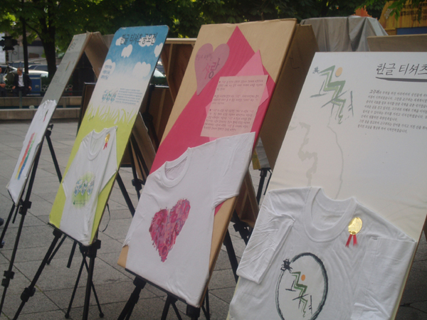 2005년 10월 5일 (수) 오전 11시부터 서울 세종문화회관 분수대광장에서 있었던 한글날 기념 '한글무늬옷(한글티셔츠) 공모 작품 전시와 나눠주기' 행사의 한 모습입니다. <찍은 이: 꿈돌이, 2005년 10월 5일.>