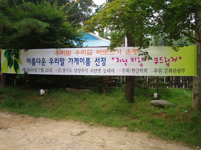 2005년 7월 25일 (월) 오후 4시부터 경기도 남양주시 조안면 능내리에 있는 '저녁바람이 부드럽게'에서 2005년 첫 번째 아름다운 우리말 가게이름 행사를 하였습니다. 이 그림은 이 날 가게 앞에 걸어 놓은 현수막의 모습입니다. <찍은 이: 꿈돌이, 2005년 7월 25일.>
