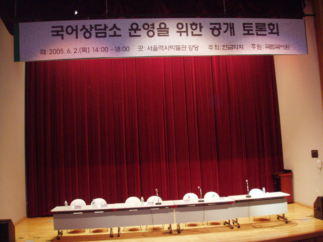 2005년 6월 2일 (목) 오후 2시부터 서울역사박물관 강당에서 있은 '국어상담소 운영을 위한 공개 토론회' 연단의 모습. <찍은 이: 꿈돌이, 2005. 6. 2.>