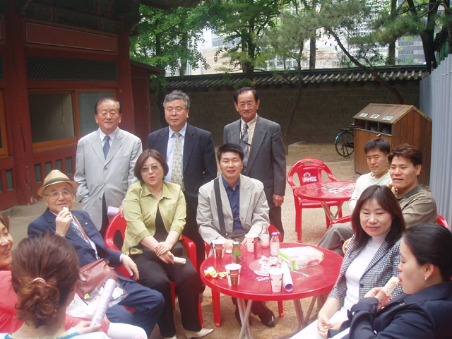 2005년 5월 14일 (토) 오전 9시부터 덕수궁 세종대왕 동상 앞에서 있은 '608돌 세종날 기념 꽃바치기 모임'과 2005년 첫 번째 우리 말글 지킴이(권혁채, 전직교사) 위촉식을 마치고 한자리에 모인 한글 학회 일꾼들. <찍은 이: 꿈돌이, 2005년 5월 14일.>