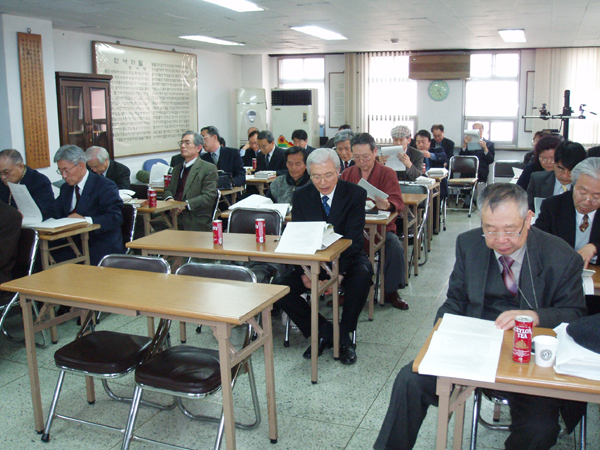 2005년 3월 26일 (토) 오후 2시부터 한글 회관 강당에서 있은 '2005년도 한글 학회 평의원회/정기총회'에서 참석한 회원들이 총회 관련 서류를 살펴보고 있는 모습니다. (찍은 이: 꿈돌이, 2005년 3월 26일.)