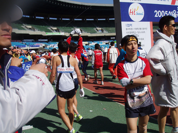 2005년 3월 13일 (일) 아침, '2005서울국제마라톤대회 겸 제76회동아마라톤대회에서 등에 '한글날을 국경일로' 등판 딱지를 붙이고 출발지인 세종로에서 결승점인 잠실종합운동장까지 42.195㎞를 완주한 참가 선수들의 모습. 이 날 한글날국경일제정범국민추진위원회가 주최하고 한글학회, 세종대왕기념사업회, 외솔회, 한글인터넷주소총연합회가 후원하여 이 마라톤 대회에서 한글날 국경일 제정 추진을 위한 홍보 운동을 하였다. 새벽부터 한글 학회 직원들과 관련 단체 회원들, 김제에서 마라톤 대회에 참가하기 위해 올라 온 정 갑주 할아버지 외 20여 명 등 한글 사랑을 실천하는 이들은, 출발지인 세종로 세종문화회관 앞에서 마라톤 대회에 참가한 선수들의 등에 '한글날을 국경일로!'(가로 27.5×8.5㎝)라고 세긴 등판 딱지(스티커) 5,000장을 붙여 주거나 나누어 주었다. (찍은 이: 꿈돌이, 20050313.)