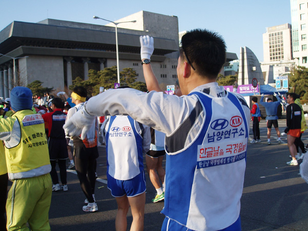 2005년 3월 13일 (일) 아침, '2005서울국제마라톤대회 겸 제76회동아마라톤대회 출발지인 세종로(세종문화회관 앞)에서 참가 선수들이 출발을 기다리고 있는 모습. 참가 선수의 등에 '한글날을 국경일로!' 등판 딱지가 눈에 띈다. 이 날 한글날국경일제정범국민추진위원회가 주최하고 한글학회, 세종대왕기념사업회, 외솔회, 한글인터넷주소총연합회가 후원하여 이 마라톤 대회에서 한글날 국경일 제정 추진을 위한 홍보 운동을 하였다. 새벽부터 한글 학회 직원들과 관련 단체 회원들, 김제에서 마라톤 대회에 참가하기 위해 올라 온 정 갑주 할아버지 외 20여 명 등 한글 사랑을 실천하는 이들은, 마라톤 대회에 참가한 선수들의 등에 '한글날을 국경일로!'(가로 27.5×8.5㎝)라고 세긴 등판 딱지(스티커) 5,000장을 붙여 주거나 나누어 주었다. (찍은 이: 꿈돌이, 20050313.)