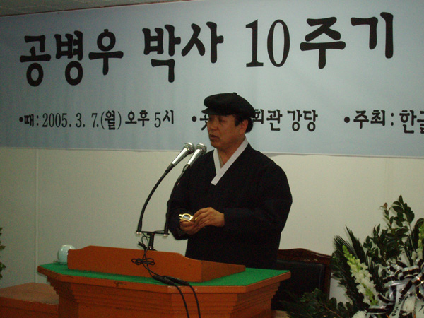 2005년 3월 7일 (월) 오후 5시에 한글 회관 강당에서 있은 공병우 박사 10주기 추모식에서 송 현(한글 문화원 원장, 시인) 선생님께서 한글 기계화의 선구자 공 병우 박사님에 대한 이야기를 하고 있는 모습입니다. (찍은 이: 꿈돌이, 20050307.)