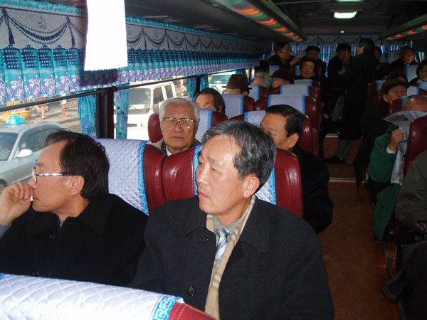 2005년 1월 26일 (수)에 모란공원 안 눈뫼 스승 무덤터(경기도 남양주시 화도읍 월산리)에서 가진 1주기 추모식을 마치고 돌아오는 버스 안의 모습. 이 날 추모식에는 눈뫼 허 웅 선생의 제자와 후학들, 그리고 유족들이 자리를 함께하였다. 이 날 모인 이는 모두 70명 가까이 되었다. (찍은 이: 꿈돌이, 2005년 1월 26일.)