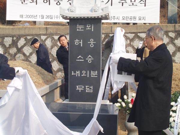 2005년 1월 26일 (수)에 모란공원 안 눈뫼 스승 무덤터(경기도 남양주시 화도읍 월산리)에서 한글 학회 김 계곤 회장이 새로 세운 묘비의 막을 걷어 내고 있는 모습. (찍은 이: 꿈돌이, 20050126.)