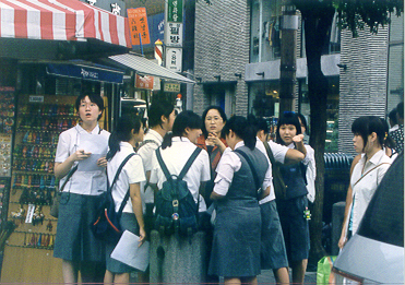 2004년 9월 15일, 강남 중학교 '사회 참여 체험 학습의 날'에 인사동에서 거리 간판 조사를 하다가 모인 5조와 6조 친구들. 신 미숙 선생님과 혜성이, 예슬이, 여진이, 예하, 명희, 민정이, 승은이, 현진이.