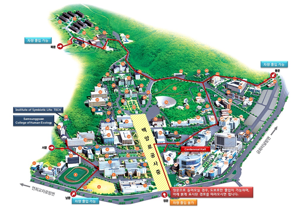 현재 연세대학교 정문은 백양로 공사로 인하여 차량이 출입이 불가하며,