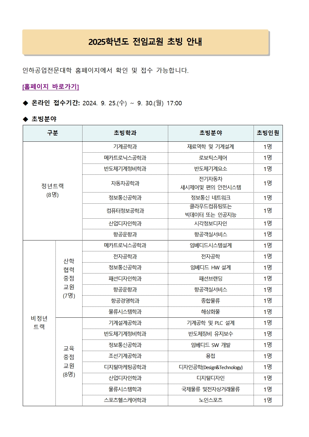 [인하공업전문대학] 2025학년도 전임교원 초빙 공고
