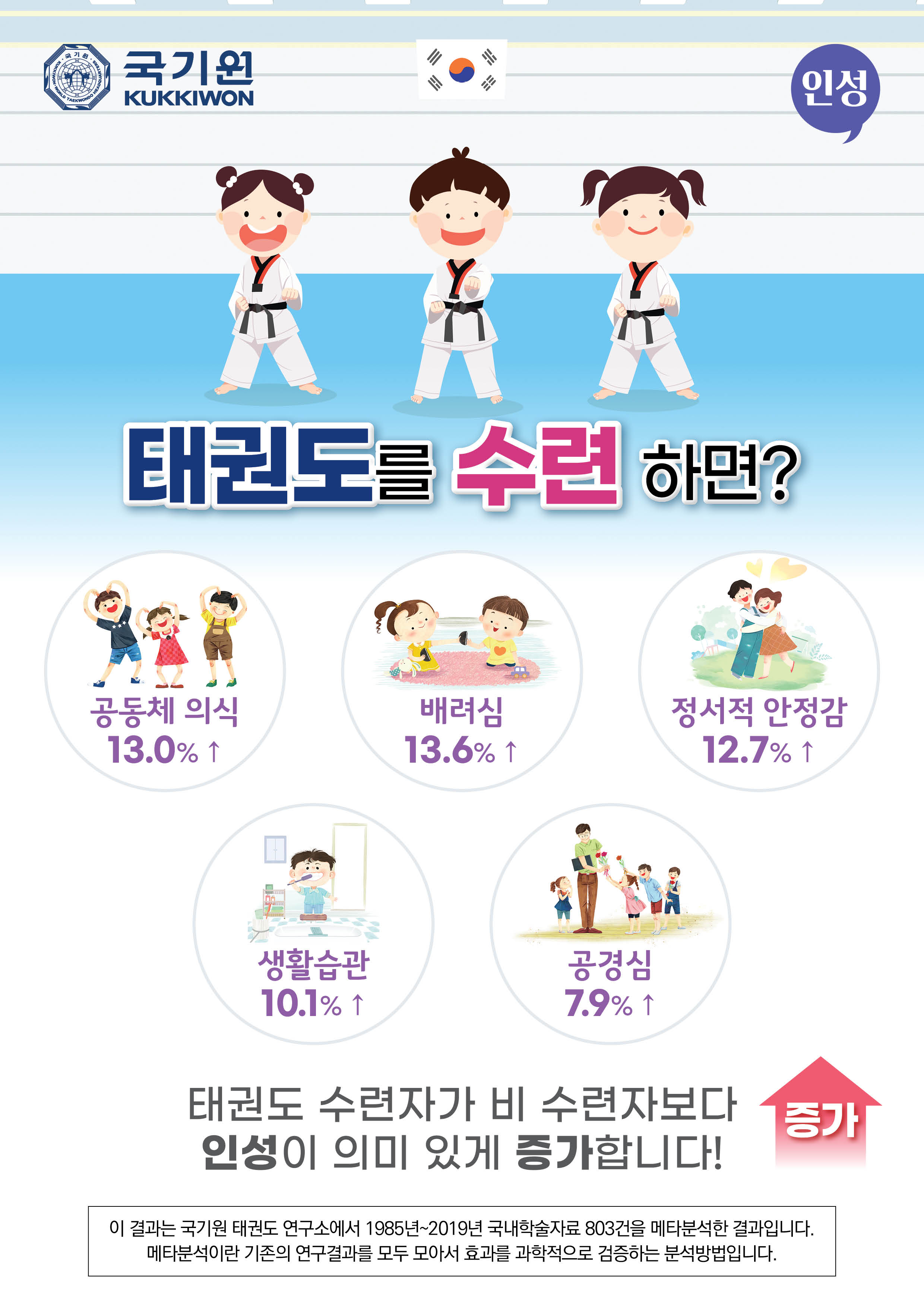 태권도를 수련하면 공동체의식, 배려심, 정서, 생활습관, 공경심 등이 더 개선된다는 연구결과입니다.
