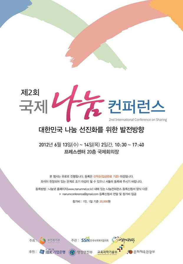 최근 우리 사회에 증가하고 있는 나눔에 대한 관심을 문화로 정착시키기 위한 제도적 기반 구축을 추진하고, 국민들이 따뜻한 행복나눔에 동참할 수 있는 분위기 조성을 위해 “제2회 국제나눔컨퍼런스(2nd International Conference on Sharing)'를 개최합니다.