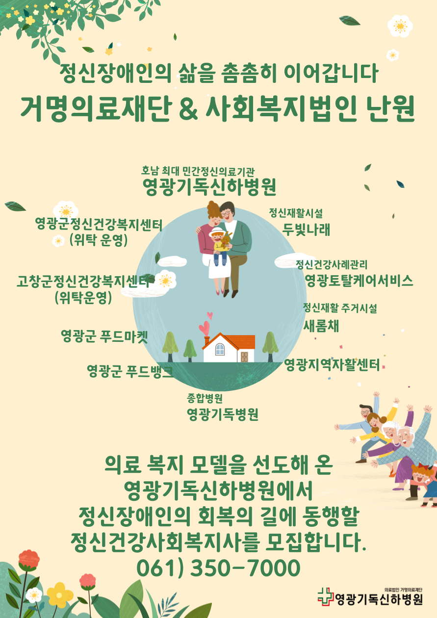 의료복지모델을 선도해 온 영광기독신하병원에서 2024년 새로운 도약을 준비하며 전문 인력을 충원합니다. 정신장애인의 회복의 길에 동행하며 함께 성장해 가실 정신건강사회복지사들의 많은 관심 부탁드립니다.