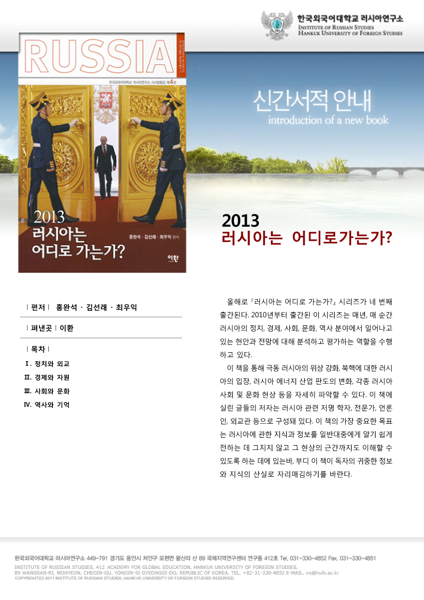 올해라 '러시아는 어디로 가는가?' 시리즈가 네 번째 출간된다. 2010년부터 출간된 이 시리즈는 매년, 매 순간 러시아의 정치, 경제, 사회, 문화, 역사 분야에서 일어나고 있는 현안과 전망에 대해 분석하고 평가하는 역할을 수행하고 있다. 이 책을 통해 극동 러시아의 위상 강화, 북핵에 대한 러시아의 입장, 러시아 에너지 산업 판도의 변화, 각종 러시아 사회 및 문화 현상 등을 자세히 파악할 수 있다. 이 책에 실린 글들의 저자는 러시아 관련 저명 학자, 전문가, 언론인, 외교관 등으로 구성돼 있다. 이 책의 가장 중요한 목표는 러시아에 관한 지식과 정보를 일반대중에게 알기 쉽게 전하는 데 그치지 않고 그 현상의 근간까지도 이해할 수 있도록 하는 데에 있는바, 부디 이책이 독자의 귀중한 정보와 지식의 산실로 자리매김하기를 바란다.