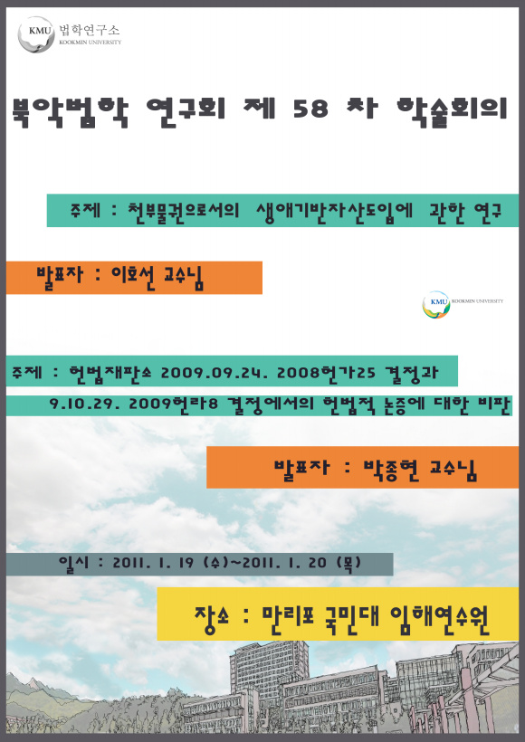 주제1 : 천부물권으로서의 생애기반자산도입에 관한 연구발표자 : 이호선 교수님주제2 : 헌법재판소 2009.09.24. 2008헌가25 결정과 2009.10.29. 2009헌라8 결정에서의 헌법적 논증에 대한 비판 발표자 : 박종현 교수님일시 : 2011.1.19(수)-20(목)장소 : 만리포 국민대 임해연수원