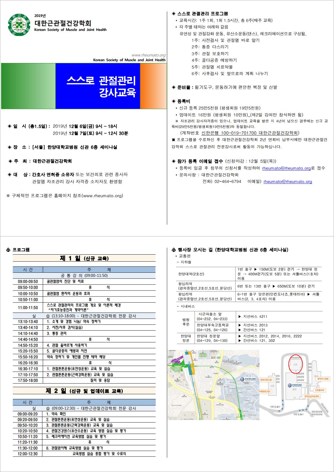이에 전국의 관절염 환자 관리에 수고하시는 선생님들을 대상으로 아래와 같이 강사교육을 실시합니다.
