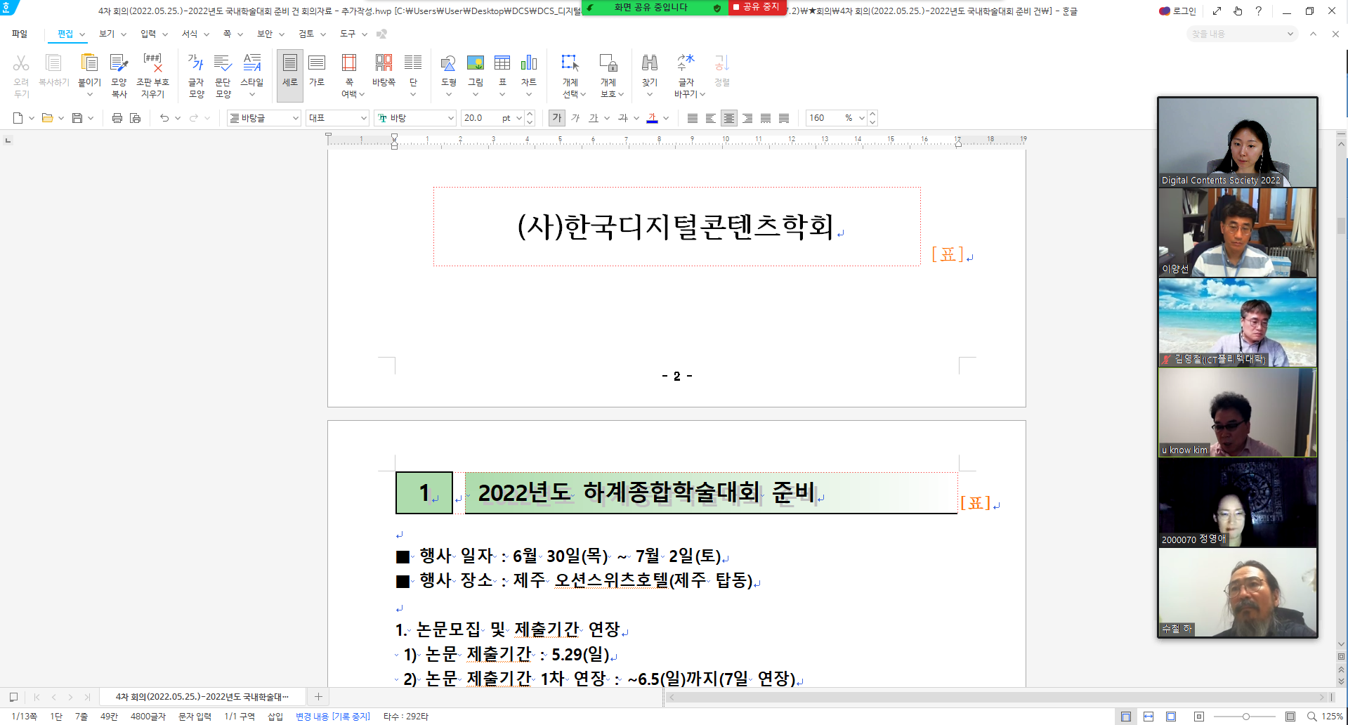 2022년도 한국디지털콘텐츠학회 국내학술대회 준비 4차 회의가 아래와 같이 진행되었습니다.