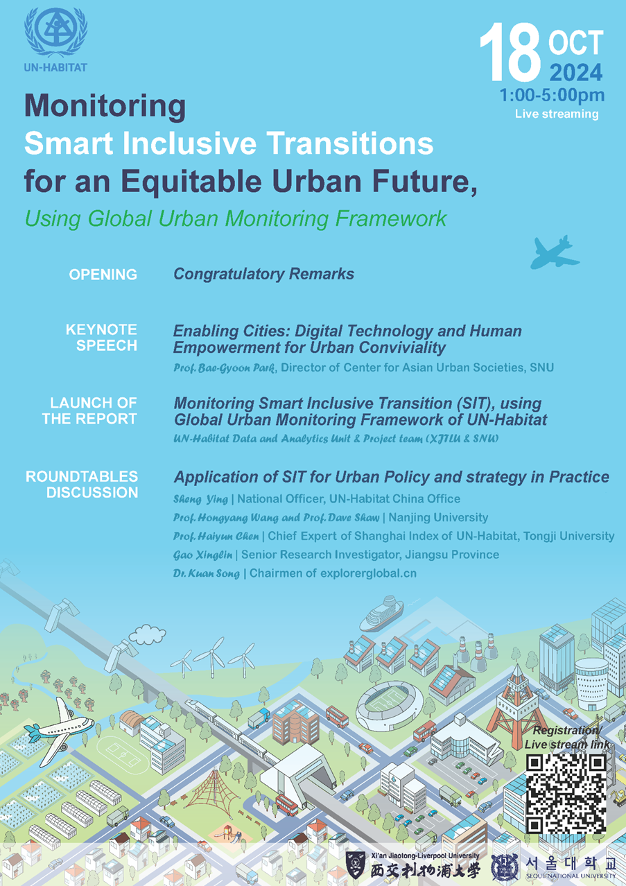 By 2030, two-thirds of the global population is expected to live in cities, transforming urban areas into hubs of both innovation and inequality. This raise a critical question: how can we reshape our approach to creating more equitable and sustainable urban futures? This symposium-launch event will introduce the "Smart-Inclusive Transition (SIT)," a collaborative initiative developed by UN-Habitat, Xi’an Jiaotong-Liverpool University, and Seoul National University, from 1:00 to 5:00 pm on October 18, 2024.