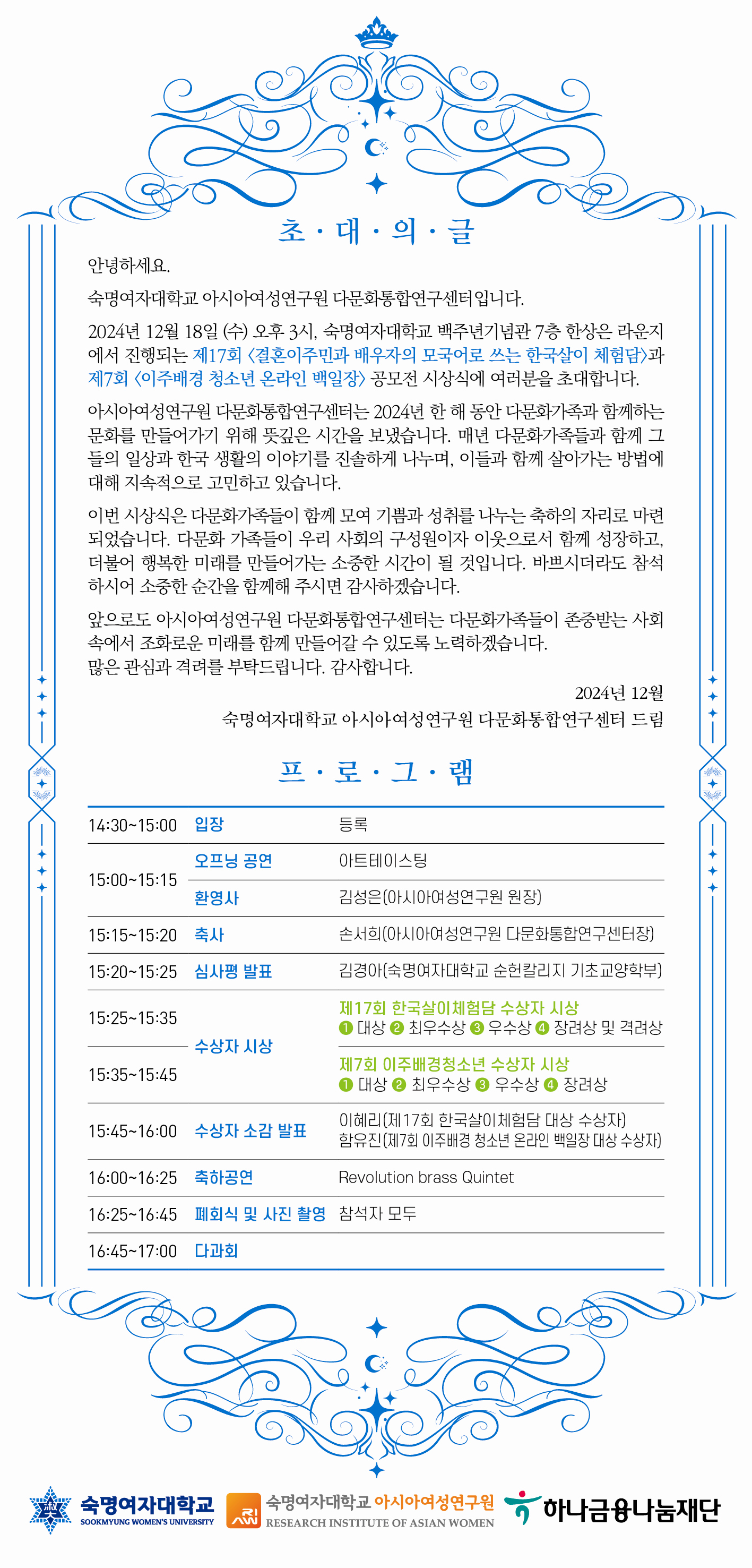[2024 하나금융나눔재단 공모전 시상식] 제17회 한국살이체험담 및 제7회 이주배경 청소년 온라인 백일장 공모전 시상식 진행 (12월 18일(수))