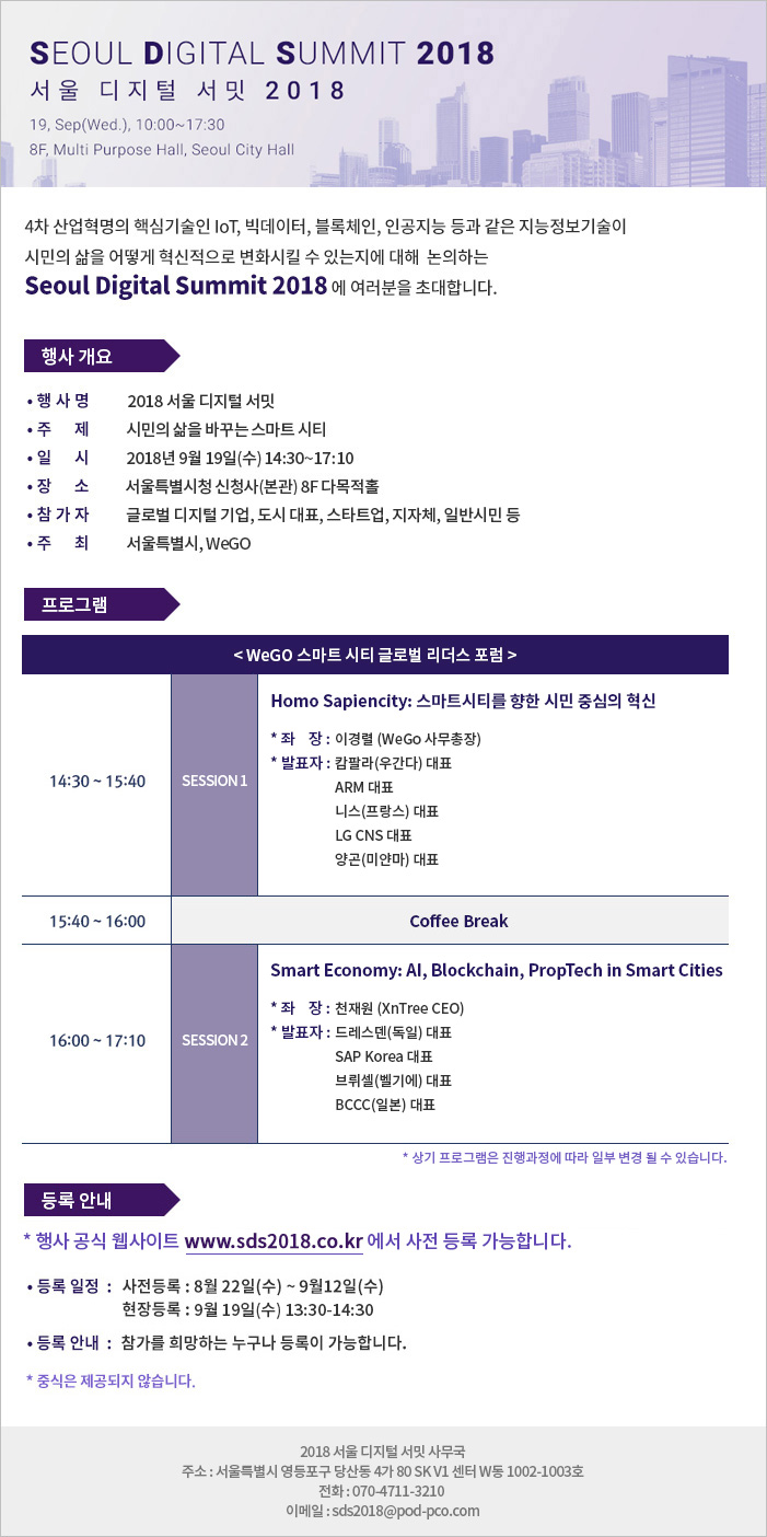 4차 산업혁명의 핵심기술인 IoT, 빅데이터, 블록체인,인고지능 등과 같은 지능정보기술이 시민의 삶을 어떻게 혁신적으로 변화시킬 수 있는지에 대해 논의하는 Seoul Digital Summit 2018 에 여러분을 초대합니다.